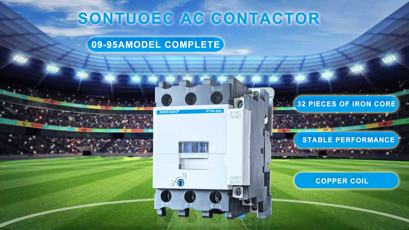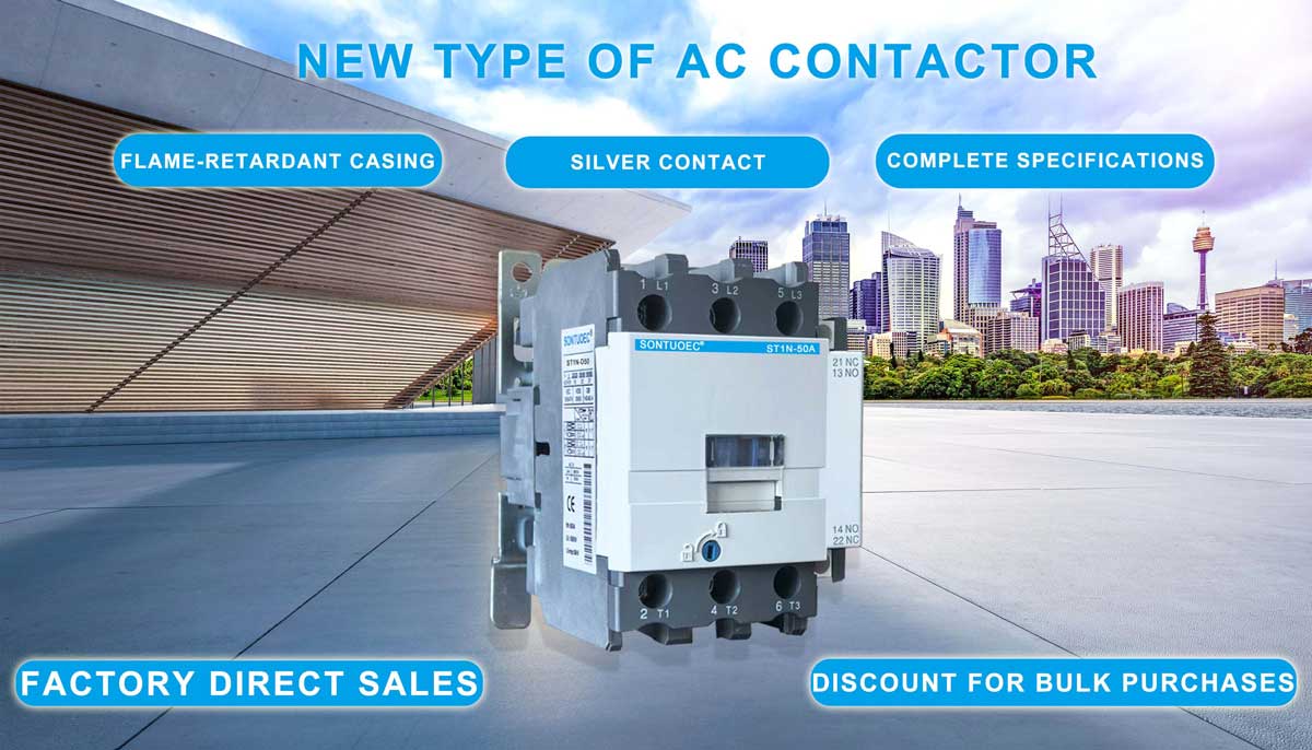 SONTUOEC є одним із китайських постачальників/виробників, що спеціалізується на виробництві різних малих електроприладів. Контактор змінного струму серії ST1N підходить для використання в ланцюгах номінальної напруги до 660 В змінного струму 50 Гц або 60 Гц, номінального струму до 95 А, для вмикання та відключення, частого запуску та керування двигуном змінного струму. У поєднанні з блоком допоміжних контактів, таймером затримки та пристроєм блокування машини тощо, він стає контактором затримки, контактором механічного блокування, пускачем із зірки на трикутник. З тепловим реле об'єднується в електромагнітний пускач. Контактор виготовляється відповідно до IEC 60947-1.